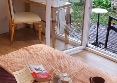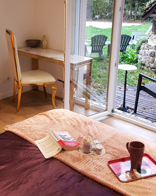 Votre cocon privé s’ouvre sur le jardin par une grande baie vitrée. Lit king size 160cm, bureau pour télétravailler si besoin et cette vue… Réveil garanti avec le sourire !