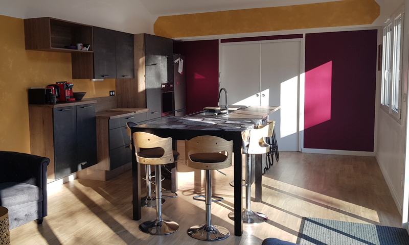 Le cœur de la villa s’ouvre généreusement sur le jardin. Cuisine ouverte ultra-équipée, coin salon avec TV 39 pouces, table haute pour 6 personnes… Tout est pensé pour que vous vous sentiez immédiatement chez vous.